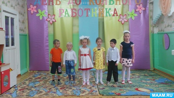 Праздник «День дошкольного работника». Сценарий поздравления детей. Под музыку «Наш любимый детский сад» в зал входят дети подготовительной группы. Ведущий: Здравствуйте, коллеги, с праздником друзья! Сегодня день особенный, забыть о нём нельзя! Сегодня в этом зале собрались все, кто делает жизнь ребёнка в детском саду интересной и насыщенной, комфортной и безопасной. Примерно 141 год назад был открыт первый в России детский сад. 27 сентября мы все отмечаем праздник «День дошкольного работника. Поздравляем вас, дорогие сотрудники! Ксюша: Эти мы стихи учили, Чтоб поздравить вас сейчас, Воспитатели и няни, Очень любим, ценим вас! Вам желаем мы успехов, С вами очень хорошо, Интересно нам не страшно, Каждый рад, что в сад пришёл. Артём: В день воспитателя хотим, Добра вам пожелать. От всей души благодарим, Поменьше уставать. Мы, вам спасибо говорим, И очень вами дорожим. Серёжа. К Желаем, чтоб звучал наградой Для вас весёлый детский смех. Чтоб жизнь любимого детсада Дарила счастье и успех! Наташа: С праздником вас, с Днём воспитателя! За ваши старания мы вам признательны, За доброе сердце, за труд и заботу, Спасибо большое за вашу работу! Таня: Добрые руки, внимательный взгляд, Каждое утро встречает ребят. Обнимет, проводит, утешит, поймёт. Пусть к детям любовь никогда не уйдёт! Лев: Воспитатель – это важно, Это – мудро и отважно! Пусть в ваш день цветы вам дарят И душевно поздравляют! Женя: Спасибо, что растите нас Достойно, терпеливо. Желаем вам успешной быть, Весёлой и счастливой. Удача пусть ещё не раз Вам лично улыбнётся. Здоровье много – много лет Пусть с вами остаётся. Ведущий: 1. Воспитатель – профессия наша, и порою без званий, наград Все равно свою любим работу торопимся все в детский сад. 2. Год за годом проходит в заботах. Все для них – для родных малышей Изучаем, внедряем в работу инновации нынешних дней. . И в потоке жизни текущей не забыть нам о мире души, Чтобы чуткими, добрыми, смелыми выходили в свет малыши. 4. Нынче праздник в детсаду - Воспитатель на виду. Поздравленья получает, о своем мирском мечтает… Все хором: Пусть исполнятся мечты, воспитательниц страны! Танец: «Маленькие звёзды» Ведущий: Дорогие педагоги, начинаем песни петь, не всегда же только будни, Надо праздники иметь. От печальных и унылых и в работе малый прок, не умеешь веселиться- Значит ты не педагог! Никогда не забывайте, что Макаренко сказал: «Я бы мрачных педагогов, близко к детям не пускал!» Исполняется песня на мотив «Голубой вагон» 1.Только утром зорька занимается, на работу весело зовет, Мы с постели бодро поднимаемся, так вот каждый день из года в год. Припев: Скатертью, скатертью дальний путь стелется, Сколько саду отдано и души, и лет! Каждому, каждому стал он словно родной, Лучше сада нашего в целом мире нет. 2.Медленно минуты уплывают вдаль, в детсаду обычно дел полно, Иногда нахлынет легкая печаль, потому что дома ждут давно. Припев: Скатертью, скатертью дальний путь стелется, Сколько саду отдано и души, и лет! Каждому, каждому стал он словно родной, Лучше сада нашего в целом мире нет. 3. Да, друзья, работа воспитателя вечная дорога без конца. Выбрали и мы все сознательно, детям отдаем свои сердца. Припев: Скатертью, скатертью дальний путь стелется, Сколько саду отдано и души, и лет! Каждому, каждому стал он словно родной, Лучше сада нашего в целом мире нет. Яна: Мы очень любим с