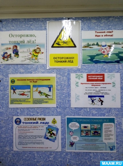 Воспитатель Непомнящих Н.Н Родительское собрание на тему: «Осторожно, тонкий лед!» Уважаемые родители! Сегодня хотелось бы поговорить о правилах поведения на водных объектах в осенне – зимний период.Зима на пороге. Реки начали покрываться тонким льдом, вода потемнела. Осенний лёд, прикрытый снегом, проруби, полыньи, лунки, трещины до наступления устойчивых морозов чрезвычайно опасны. Такой лед легко проламывается, если на него наступить, человек может оказаться в холодной воде, подо льдом. Что очень опасно не только простудами, переохлаждением, но и даже может привести к гибели. Однако каждый год многие люди, особенно дети, пренебрегают мерами предосторожности и выходят на неокрепший и непроверенный лёд. Ежегодно в осенне – зимний период на водных объектах гибнут десятки человек, в их числе дети. Ведь тысячи детей с нетерпением ждут начала зимы и появления льда на реках и озёрах. Самые нетерпеливые из них выбираются на неокрепший лёд, подвергая свою жизнь и здоровье серьёзной опасности. Важно знать и соблюдать правила безопасного поведения на водоёмах в осенне – зимний период. Несоблюдение правил безопасности на водных объектах часто становится причиной гибели людей. Осенний лёд в период с ноября по январь, т.е. до наступления устойчивых морозов, непрочен. Скреплённый вечерним или ночным холодом, он ещё способен выдерживать небольшую нагрузку, но днём, быстро нагреваясь от просачивающейся через него талой воды. Становиться пористым и очень слабым, хотя сохраняет достаточную толщину. К тому же, водоёмы замерзают не равномерно, по частям: сначала у берега, на мелководье, в защищённых от ветра заливах, а затем уже на середине. Образовавшийся первый ледяной покров привлекает детей, подростков и некоторых взрослых опробовать его на прочность. Однако тонкий лёд очень опасен. Слабый лёд не выдержит тяжести не только взрослого человека, но и ребёнка. Молодой лёд отличается от старого более тёмным цветом и тонким ровным снежным покровом без застругов и надувов. Убедительная просьба родителям: не отпускайте детей на лед без присмотра! Безопасность детей находится, прежде всего, в руках родителей. Только зная, где ваш ребенок проводит свободное время, можно избежать трагедии. Уважаемые родители, помните! Не отпускайте детей к водоемам без сопровождения взрослых. Не выходите на тонкий, неокрепший лед. Не приближайтесь к трещинам, промоинам, полыньям во льду. Не собирайтесь группами на неокрепшем осеннем льду. Не выходите на лед в темное время суток и при плохой видимости. Не выезжайте на лед на транспортных средствах. Помните, что в период ледостава несчастные случаи чаще всего происходят с детьми. Не позволяйте детям выходить к водоемам во время осеннего ледостава. Уделите внимание своим детям, расскажите об опасности выхода на непрочный лёд. Интересуйтесь, где ваш ребёнок проводит свободное время. Не допускайте бесконтрольного нахождения и игр детей вблизи водоёмов, разъясните им смертельную опасность пренебрежения данными рекомендациями. Во время отдыха вблизи водоёма дети должны находиться под постоянным, бдительным присмотром родителей. Родители, не оставляйте детей без присмотра! Будьте внимательны! Будьте внимательны к себе, к своим детям, своему здоровью, к здоровью своих детей, ведь сэкономленные пять минут не смогут з
