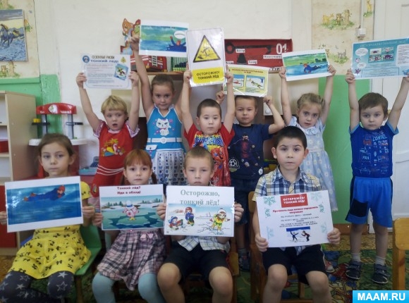 Ход беседы. Рассматривание картины «На тонком льду». - Как вы думаете, почему картинка называется «На тонком льду»? - А почему лёд оказался тонким? - Почему девочка провалилась под лёд? - Как вы думаете, кто ее спас? - Что могло бы произойти, если рядом не оказалось взрослых? - Можно ли детям одним выходить на лёд на водоёме? Почему? Воспитатель: Сам на лёд не ходи, Чтобы не было беды, Ну а с папой, мамой можно, Только всё же осторожно! С этим делом не шути, На водоём нельзя идти! Воспитатель: А как вы думаете, почему лед опасен? (ответы детей) Воспитатель: Верно, можно упасть и провалиться. Воспитатель: А когда вы идете в садик вы смотрите под ноги чтоб не упасть? (ответы детей) Воспитатель: Молодцы по улице надо ходить осторожно с мамой и папой за руку. Выводы: - Необходимо всегда слушаться взрослых. - На лёд без взрослых выходить запрещается, это очень опасно. Физкультминутка: Скользкий лед, Скользкий лед, А по нему пингвин идет. Скользкий лед, Скользкий лед, Но пингвин не упадет! Воспитатель: А теперь я вам хочу прочитать стихотворение про лед. Мама зайчиков учила, мама деткам говорила: Не гуляйте вы по льду, можете попасть в беду… Зайки слушали внимательно, были очень все старательны, Среди них зайчонок был, непослушным он прослыл. Мама в дом, он хохотать, и в хоккей зовёт играть. Зайки на него косятся, маму огорчать боятся. Зайка долго их не ждал, взял коньки и убежал. Речка льдом сверкает чистым, голубым и серебристым… Быстро он коньки надел, через снег перелетел. Не поймёшь, на льду кто мчится, то ли заяц, то ли птица, А сороки-то галдят, маму слушаться велят. Крутит зайка головой, и летит вперёд косой… Что такое? Треск какой? Зайчик наш взмахнул рукой, Обломилась корка льда, и случилась с ним беда! Провалился в воду он, треск идёт со всех сторон, Держится за кромку льда, а в коньках уже вода! А сороки тут взлетели, сразу лес весь облетели. Первый услыхал беду - волк, он шёл по берегу. Ветку толстую сломал, зайке бросил и сказал: «Ты, дружок, не суетись, лапками за сук держись». Зайка лапкой ухватился, а народ лесной столпился. Волку все кричат «Ура!» Радуется детвора. Тут и мама подбежала, пожалела, отсчитала: «Помощь не всегда придёт, можешь ты уйти под лёд!» Дети, правило простое и для вас оно такое: «Не ходите вы по льду, можете попасть в беду! И на нём вы не играйте, и, конечно, не гуляйте! Есть места, где тонкий лёд, знайте это наперёд!» Воспитатель: Ребята, давайте вспомним всё, что мы сегодня с вами узнали, все важные правила безопасности. Молодцы, ребята! Просмотр познавательного мультфильма. «Смешарики - Азбука безопасности (На тонком льду)».